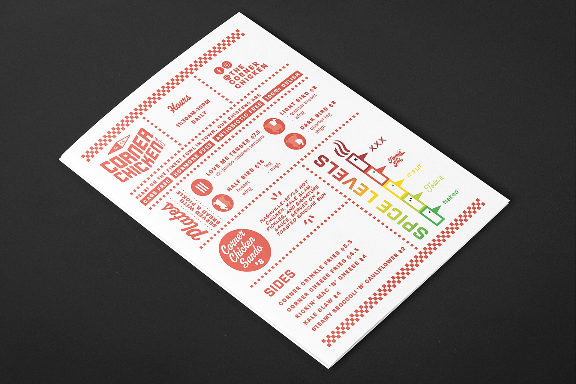 Our team was first tasked with naming the concept: the client went with ‘Corner Chicken’—simple like their menu and it played off the location of the restaurant. The next step was to design the logo and the rest of the branding elements would fall into place.